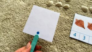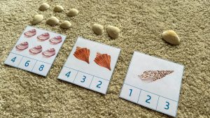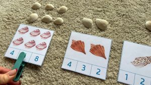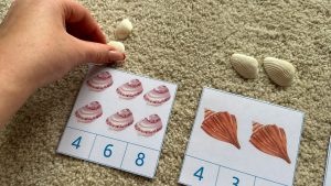 - Ako dijete računa s konkretnim predmetima, izvadi onaj broj školjki koje se nalaze na kartici, stavi ih iznad kartice i prebroji.